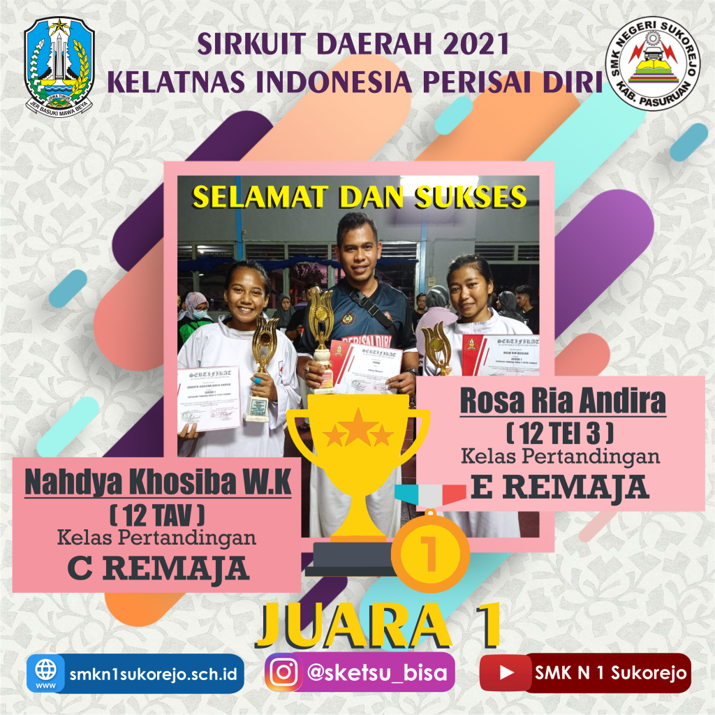 Selasa [22/03/2021], SMKN 1 Sukorejo (@sketsu_bisa) mendapatkan kejuaraan lagi. Kali ini adalah di kegiatan ekstrakurikuler yaitu Perisai Diri. Tim Perisai Diri SMKN 1 Sukorejo (@sketsu_bisa) mampu menumbangkan lawan-lawannya dan berhasil memperoleh poin maksimal yaitu masing-masing peserta mendapatkan Juara 1 di kelas pertandingan C Remaja dan E Remaja.