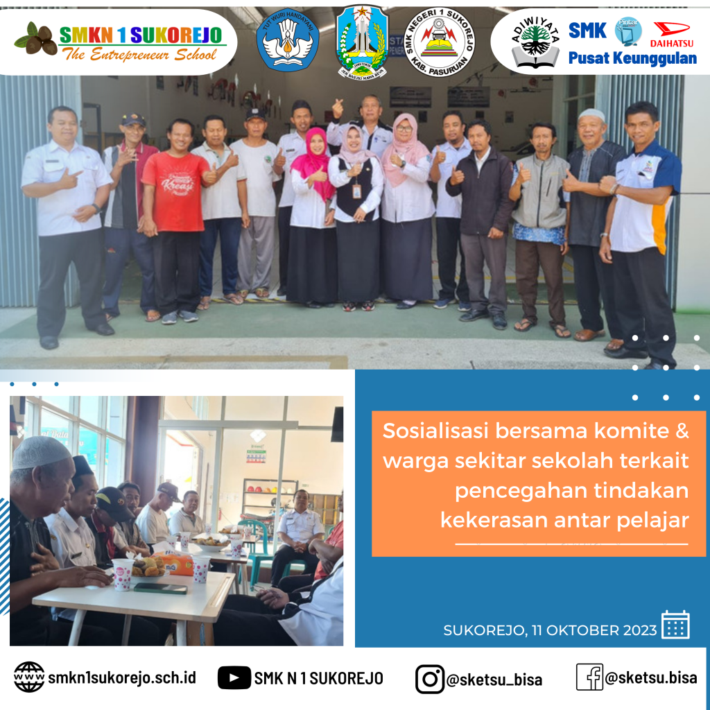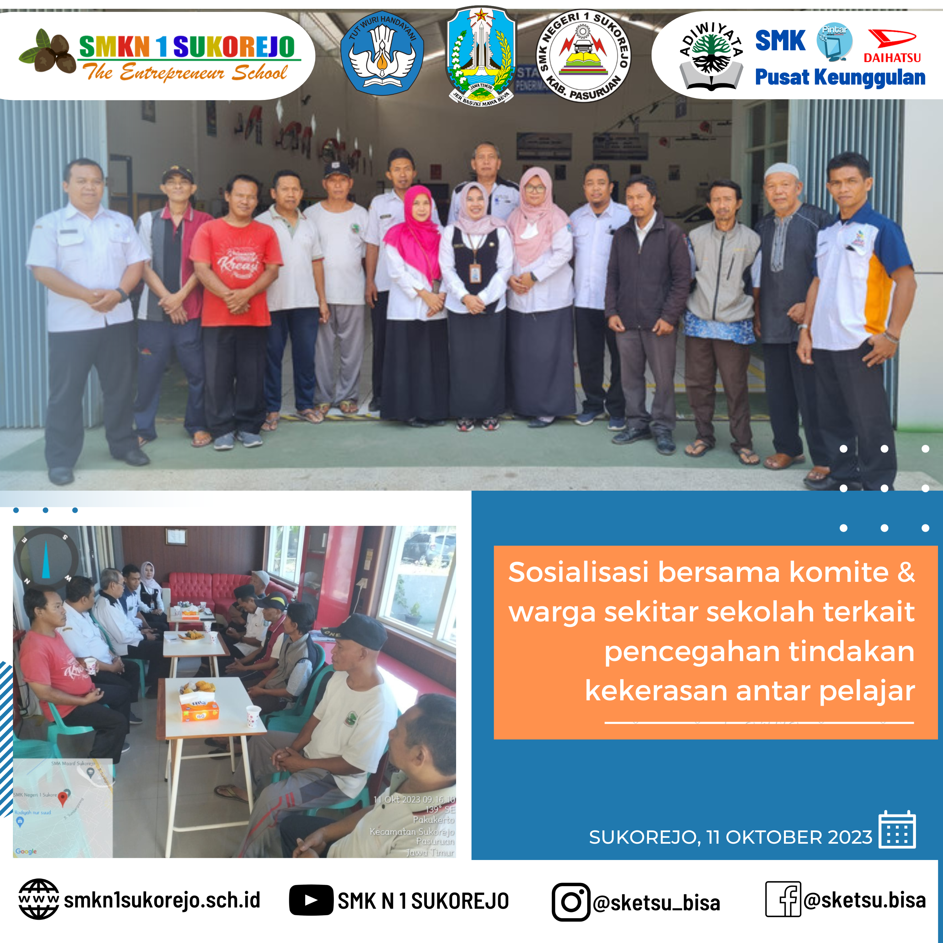 Sukorejo, 11 Oktober 2023 – Kepala SMK Negeri 1 Sukorejo mengundang Komite Sekolah dan Warga Sekitar untuk melakukan sosialisasi terkait pencegahan tindakan kekerasan antar pelajar. Dengan adanya sosialisasi ini diharapkan komite dan warga sekitar SMK Negeri 1 Sukorejo bisa saling memantau peserta didik untuk menghindari adanya kekerasan antar pelajar.