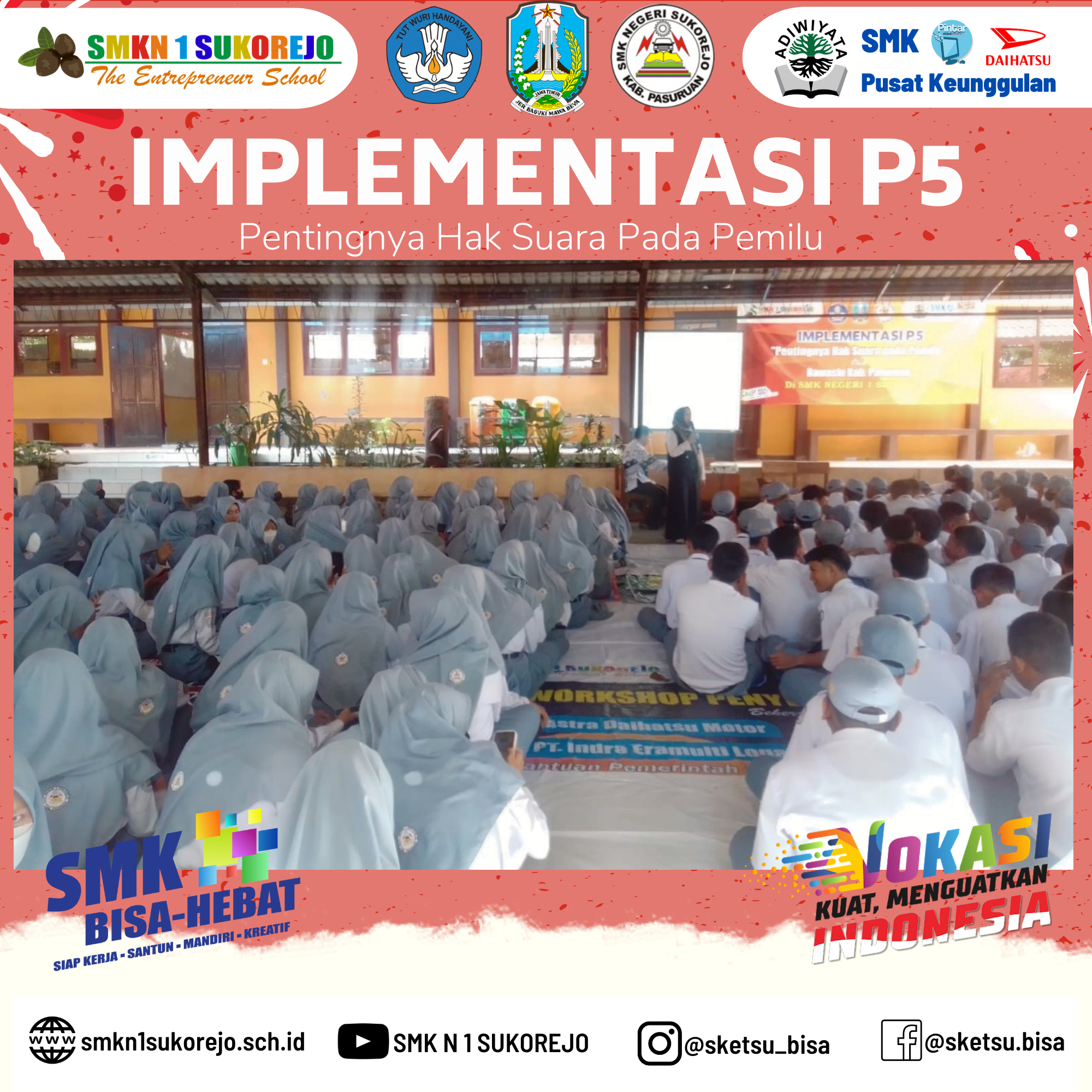 Kegiatan ini mengambil tema tentang “Pentingnya Hak Suara Pada Pemilu”. Sosialisasi ini perlu diikuti oleh peserta didik mengingat mayoritas usia peserta didik SMK Negeri 1 Sukorejo telah memenuhi syarat sebagai pemilih dalam pemilu. Peserta didik dihimbau untuk menggunakan hak suaranya dalam pemilu karena dengan menggunakan hak pilih itu artinya kita telah berkontribusi dalam memilih pemimpin masa depan kita dan negara kita. Kita harus memikirkannya betul-betul siapa yang pantas untuk memimpin Negara kita ini agar menjadi lebih baik lagi.