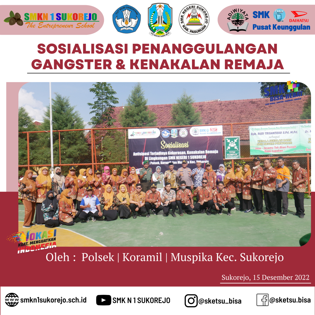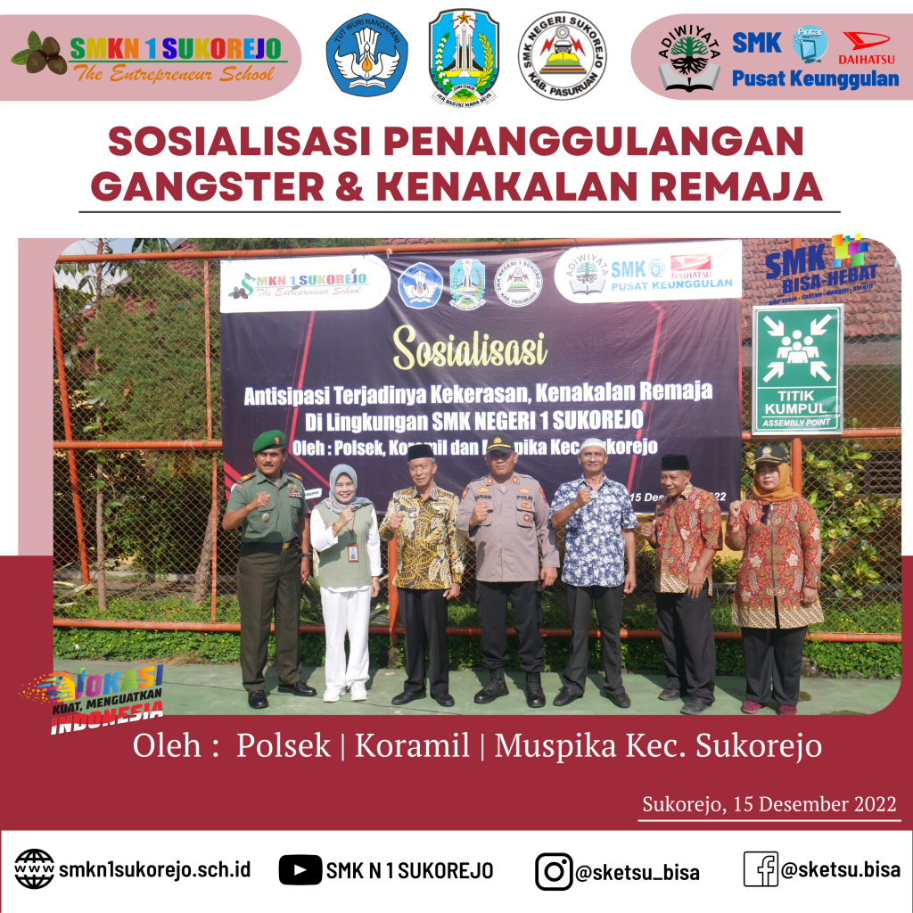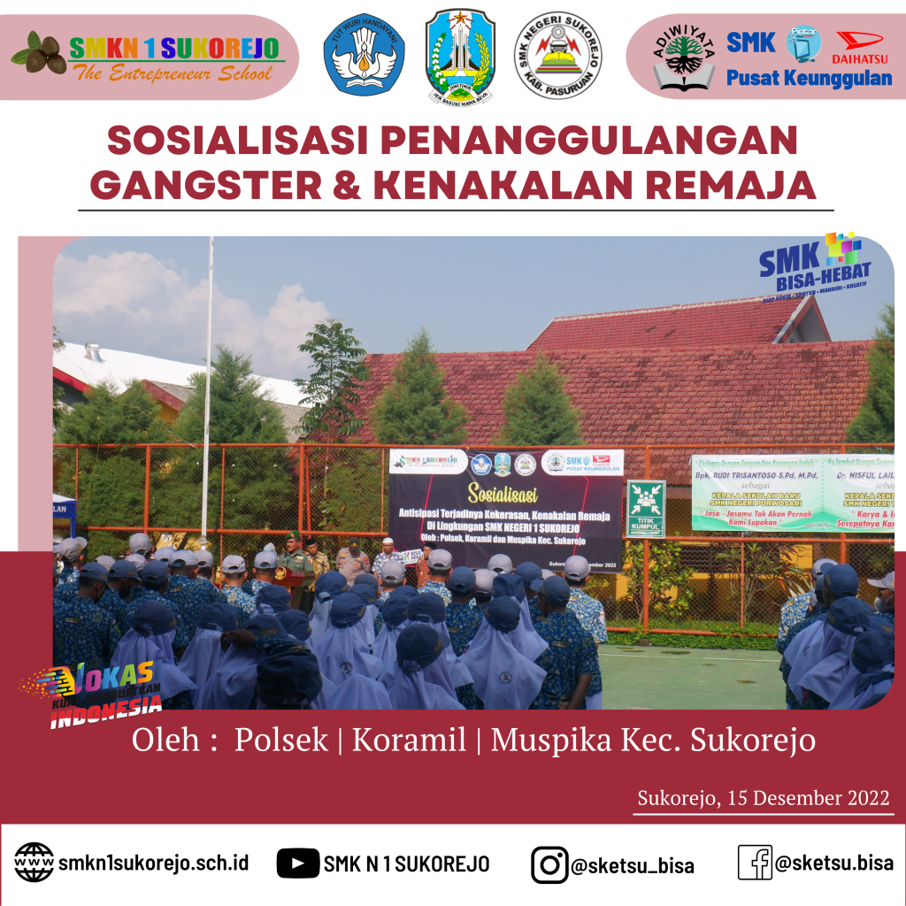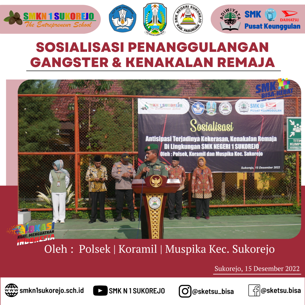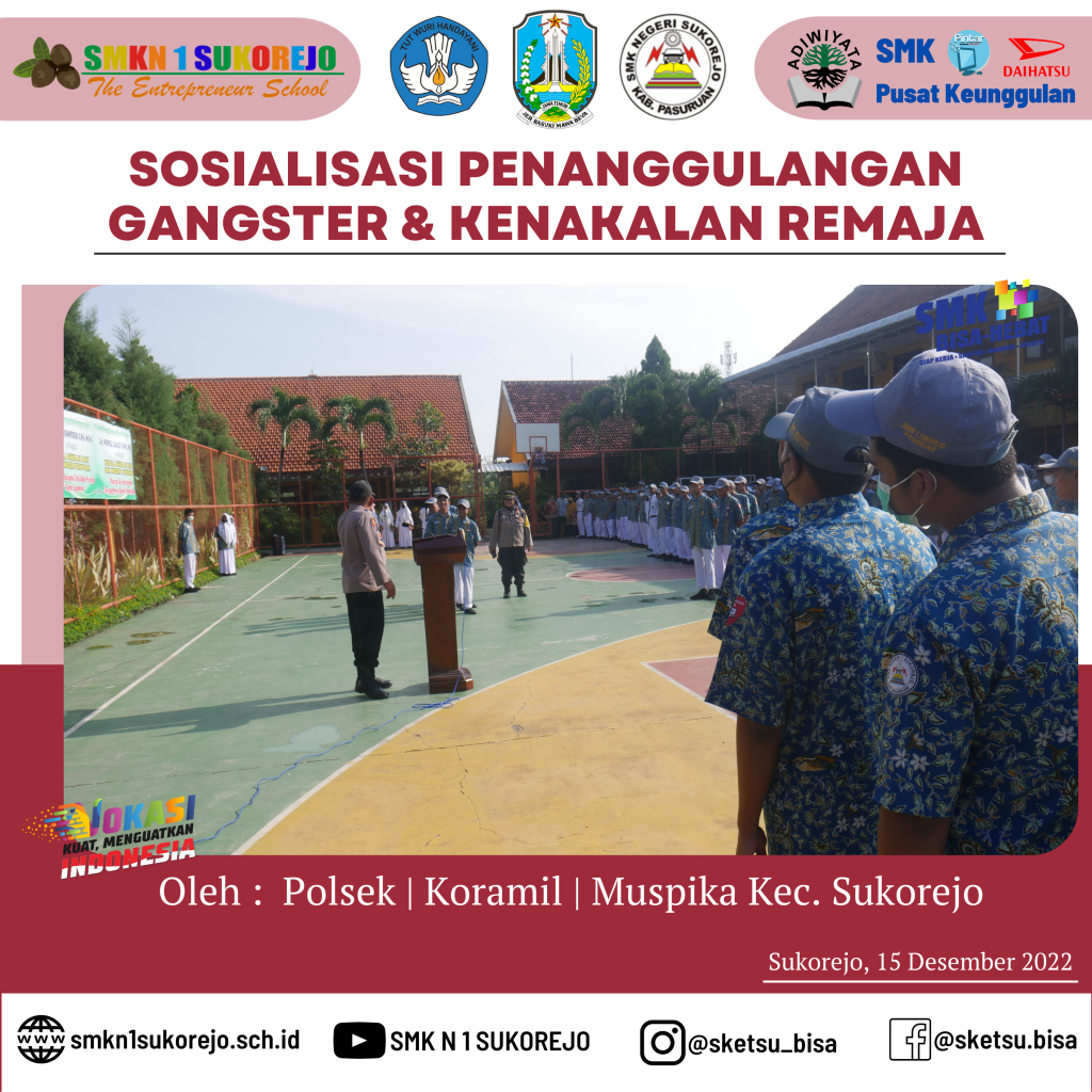 Akhir akhir ini semakin marak adanya gangster remaja diwilayah Surabaya. Maka dari itu dalam rangka penanggulangan hal negatif tersebut SMK Negeri 1 Sukorejo mengadakan sosialisasi kepada seluruh peserta didik agar terhindar dan tidak terlibat kelompok gangster.