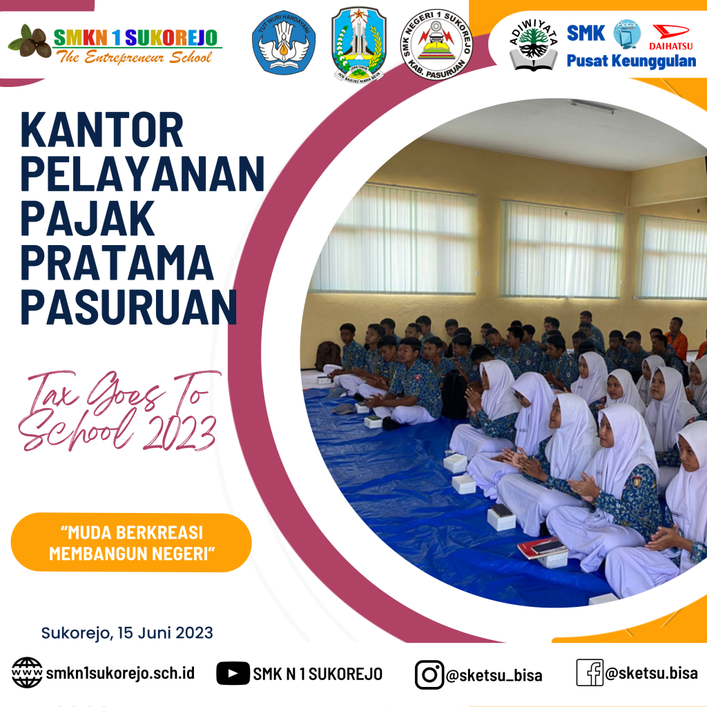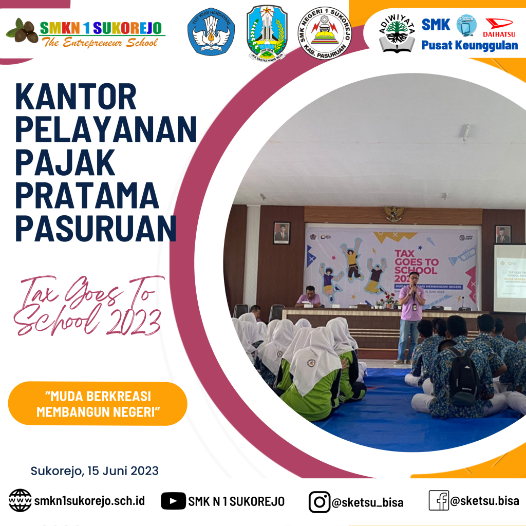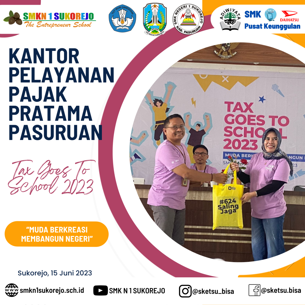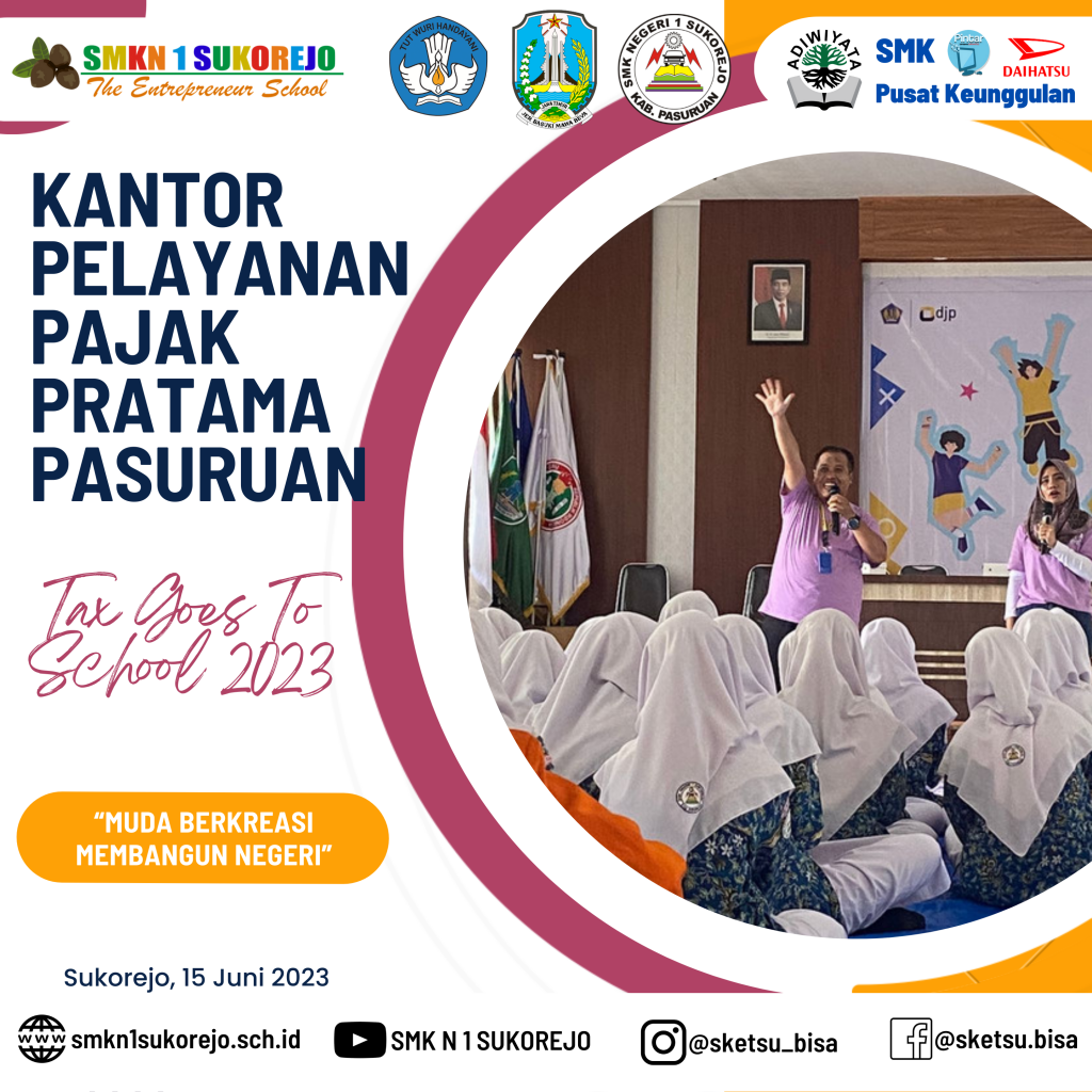 SMK Negeri 1 Sukorejo menjadi sekolah pilihan KPP Pratama Pasuruan dalam kegiatan kali ini, Tax Goes To School diisi dengan berbagai materi terkait perpajakan. Kegiatan ini bertujuan untuk meningkatkan kesadaran pajak sejak dini, dengan begitu, siswa siswi dapat memahami betapa pentingnya pajak untuk mewujudkan kesejahteraan bagi seluruh rakyat Indonesia, karena manfaat pajak sangat lekat dan dapat dirasakan dalam kehidupan sehari-hari.
