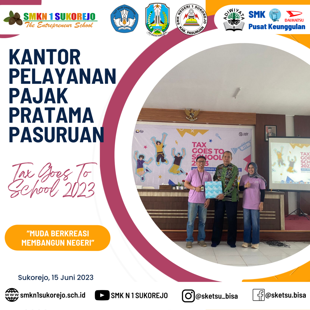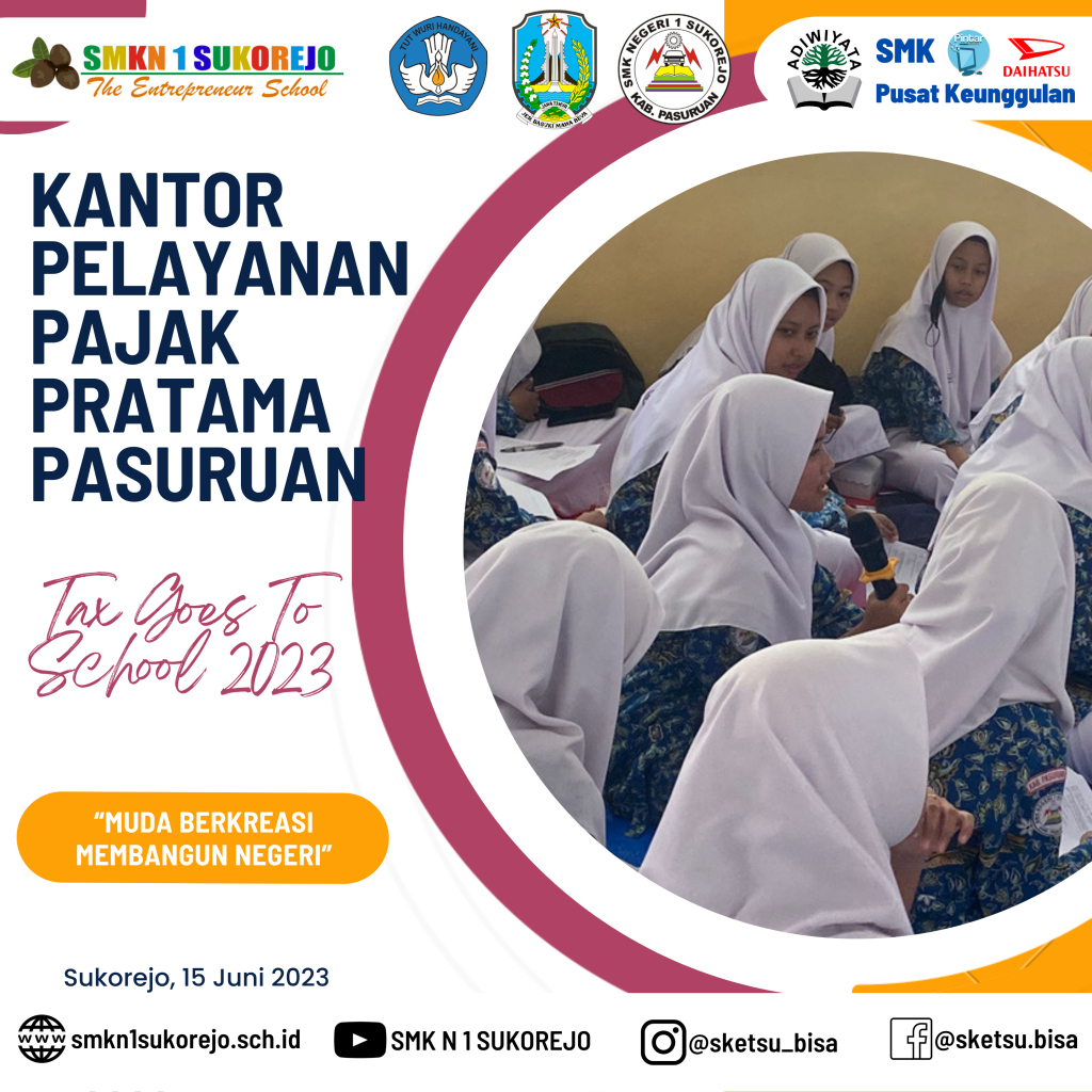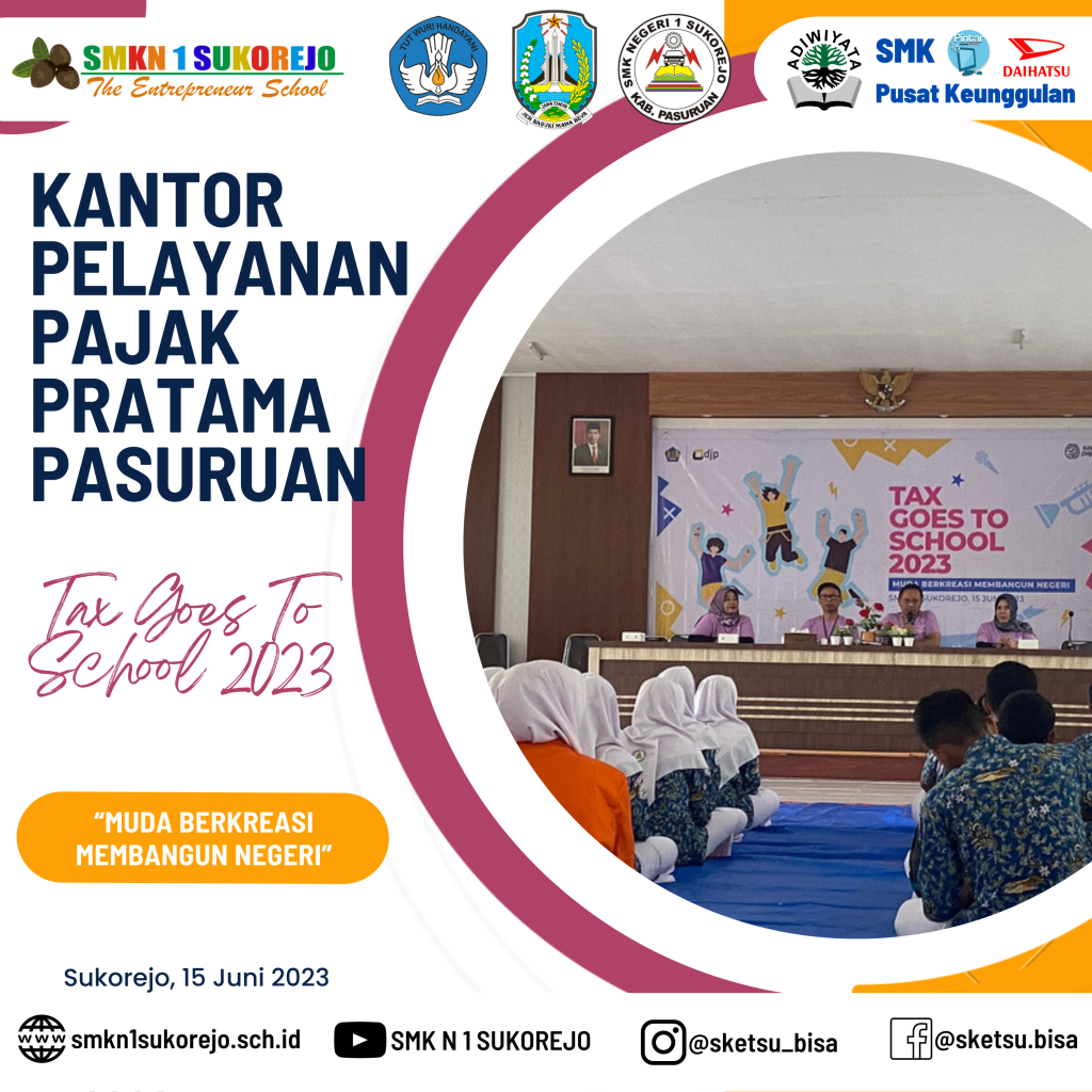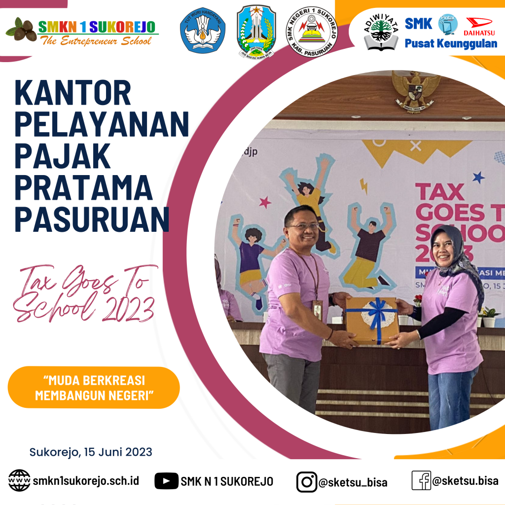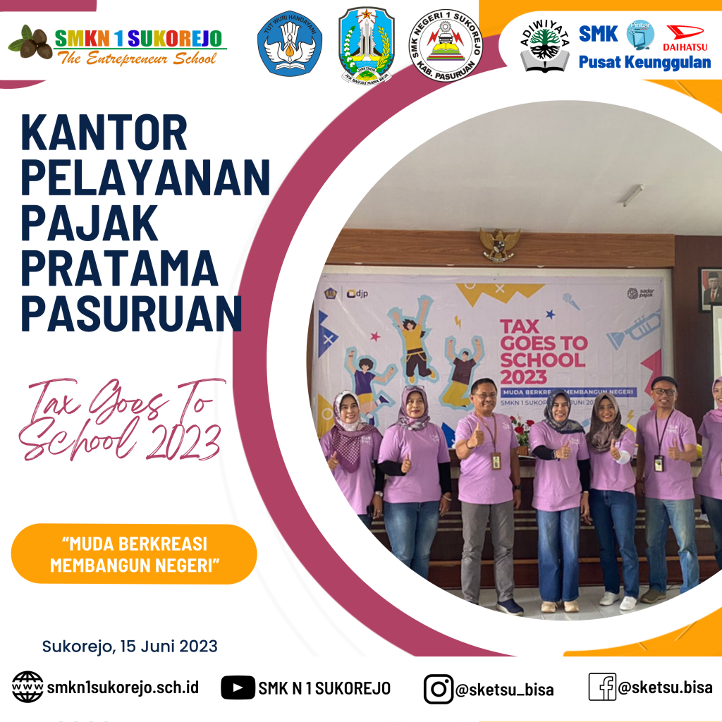 SMK Negeri 1 Sukorejo menjadi sekolah pilihan KPP Pratama Pasuruan dalam kegiatan kali ini, Tax Goes To School diisi dengan berbagai materi terkait perpajakan. Kegiatan ini bertujuan untuk meningkatkan kesadaran pajak sejak dini, dengan begitu, siswa siswi dapat memahami betapa pentingnya pajak untuk mewujudkan kesejahteraan bagi seluruh rakyat Indonesia, karena manfaat pajak sangat lekat dan dapat dirasakan dalam kehidupan sehari-hari.