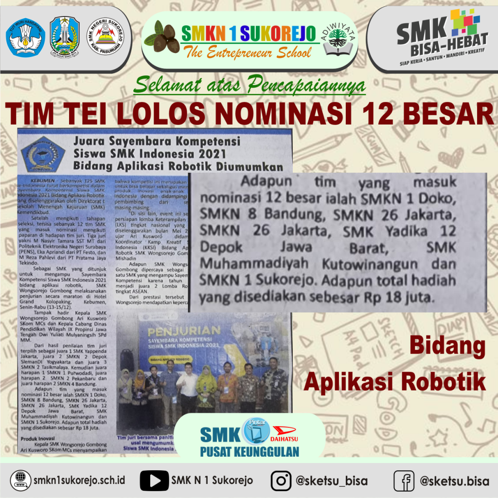 Sayembara Kompetensi Siswa SMK Indonesia 2021 diselenggarakan oleh Direktorat Sekolah Menengah Kejuruan (SMK) Kemendikbud. Sebanyak 125 SMK Se-Indonesia salah satunya sekolah SMKN 1 Sukorejo mengikuti ajang sayembara tersebut. Dari hasil penilaian juri, SMKN 1 Sukorejo masuk dalam 12 besar nominasi sayembara kompetensi siswa SMK Indonesia 2021 bidang Aplikasi Robotik.