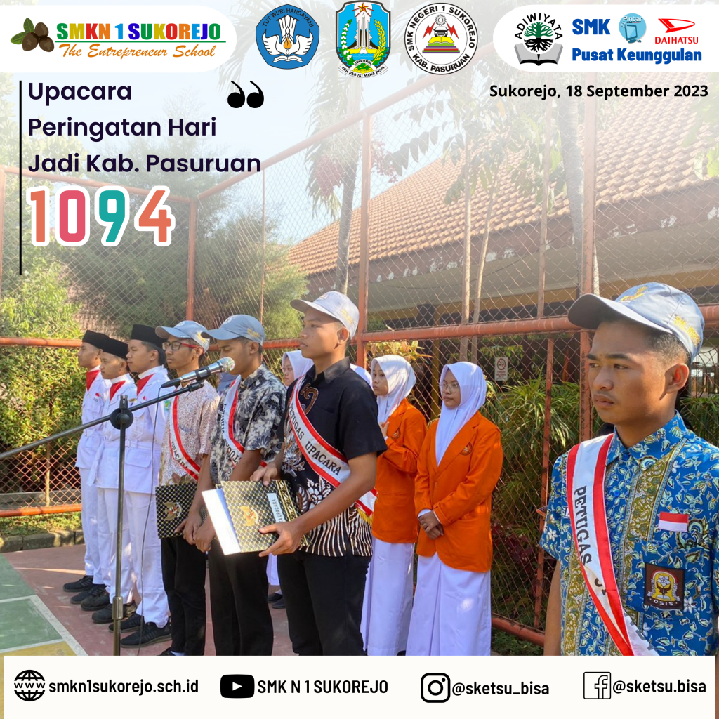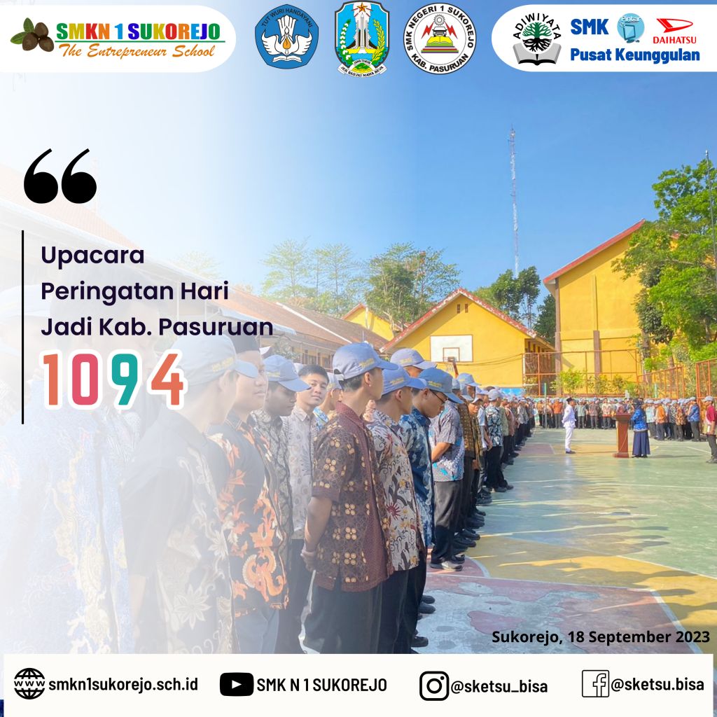 Sukorejo, 18 September 2023 bertepatan dengan peringatan hari jadi Kabupaten Pasuruan yang ke 1094 dilaksanakan upacara bendera di lapangan SMK Negeri 1 Sukorejo.