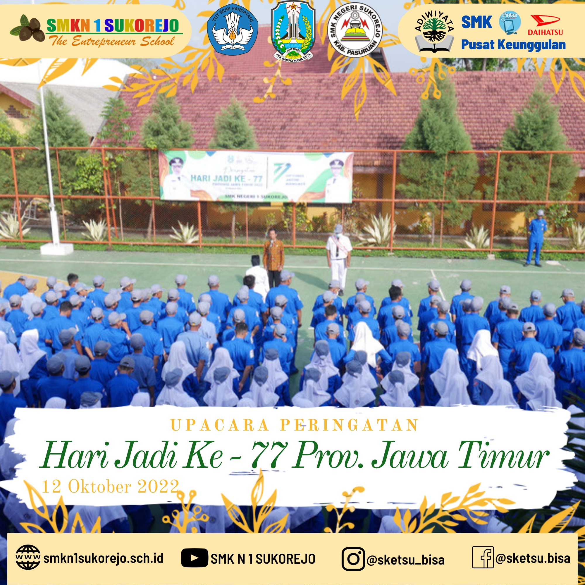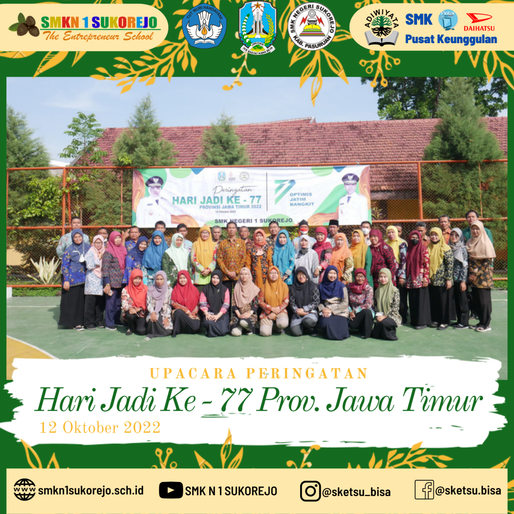 Tepat hari ini Provinsi Jawa Timur memperingati hari jadinya yang ke – 77. SMK Negeri 1 Sukorejo sebagai salah satu sekolah yang berdiri di Provinsi Jawa Timur turut merayakannya dengan melaksanakan Upacara Bendera.