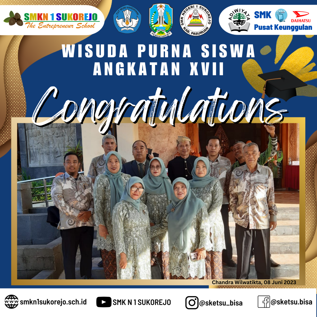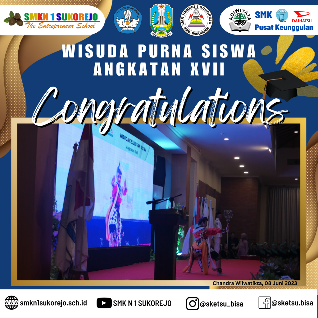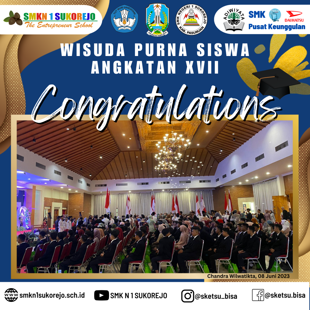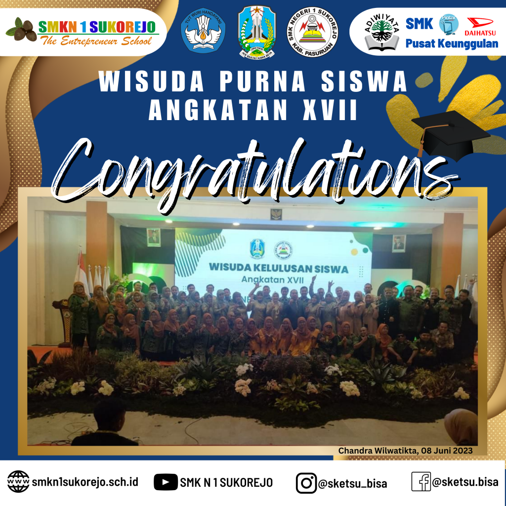 WISUDA PURNA SISWA ANGKATAN XVII SMK NEGERI 1 SUKOREJO Agenda Sekolah Informasi Sekolah Kegiatan Sekolah 9 Juni 20239 Juni 2023 adminLeave a Comment on WISUDA PURNA SISWA ANGKATAN XVII SMK NEGERI 1 SUKOREJO [SKETSU BERAKSI]Alhamdulillah serangkaian acara wisuda purna siswa SMK Negeri 1 Sukorejo telah sukses terselenggara di Taman Chandra Wilwatikta Pandaan.Selamat dan Sukses kepada 365 Wisudawan Tahun Pelajaran 2022/2023 SMK Negeri 1 Sukorejo yang telah menyelesaikan program belajar selama 3 Tahun.Awal yang baru telah dimulai, jangan berhenti belajar dan berpetualang, teruslah berusaha menjemput kesuksesan kalian.Buktikan bahwa Alumni SMK Negeri 1 Sukorejo bisa BMW (Bekerja, Melanjutkan dan Wirausaha)#smkn1sukorejo#sketsu#smkbisa#smkhebat#sketsubisahebat#sketsuberaksi#berakhlak#berkarya#berprestasi#wisuda#alumni2023#angkatan17 GALLERY