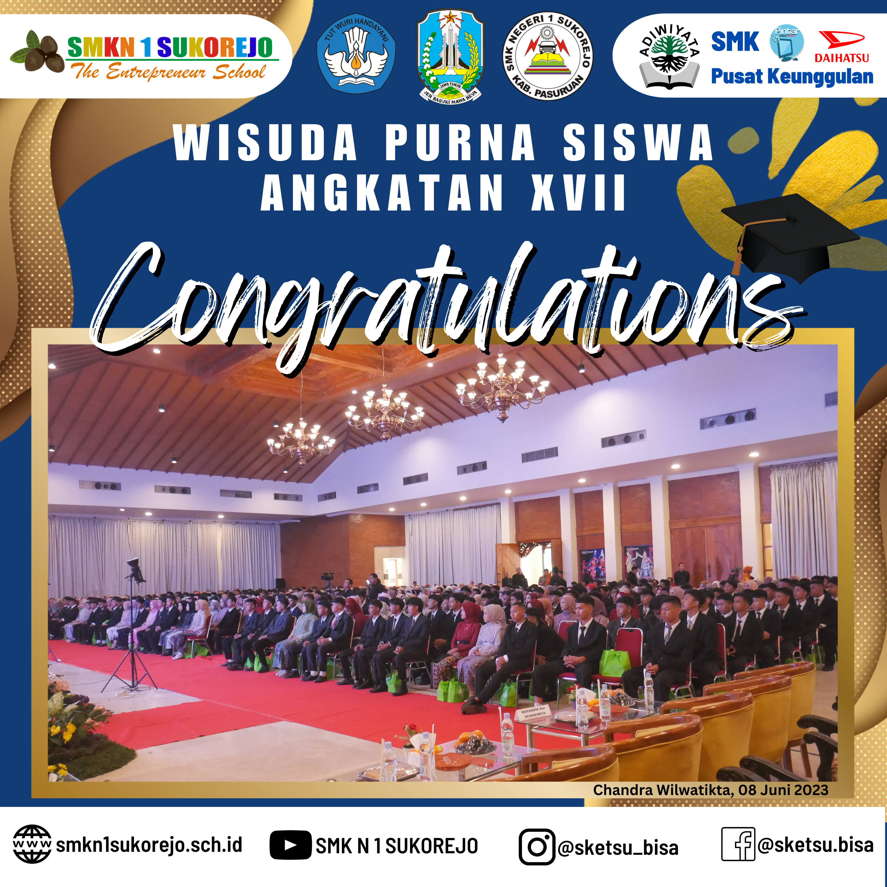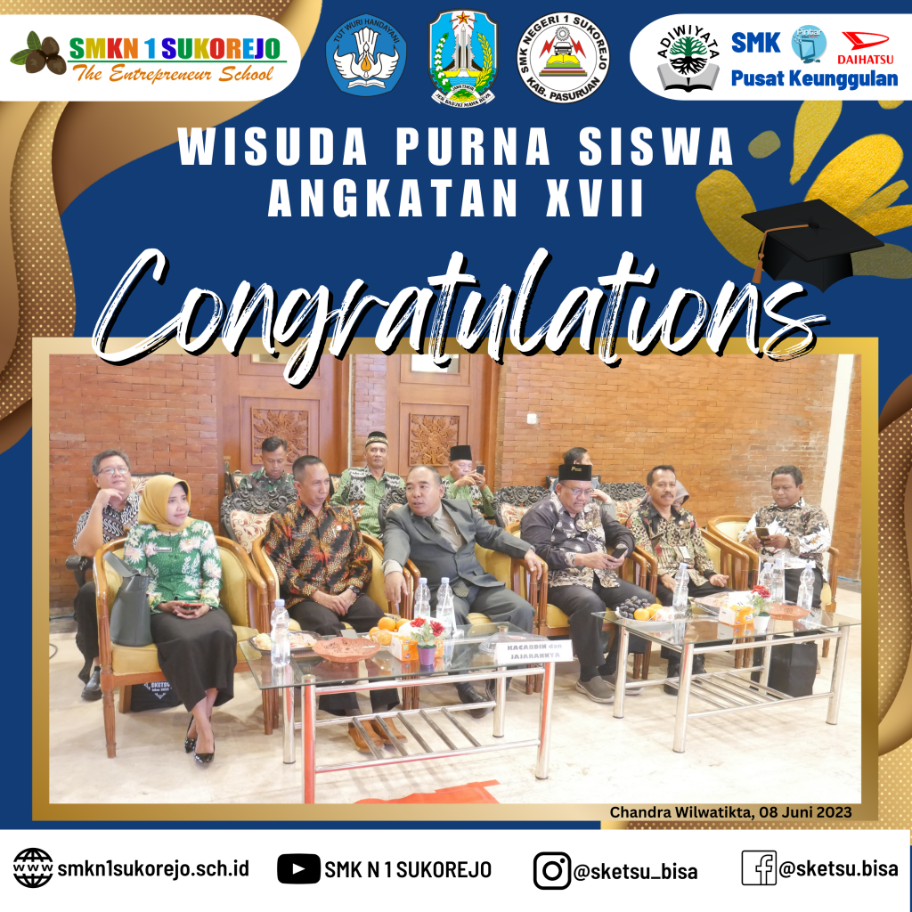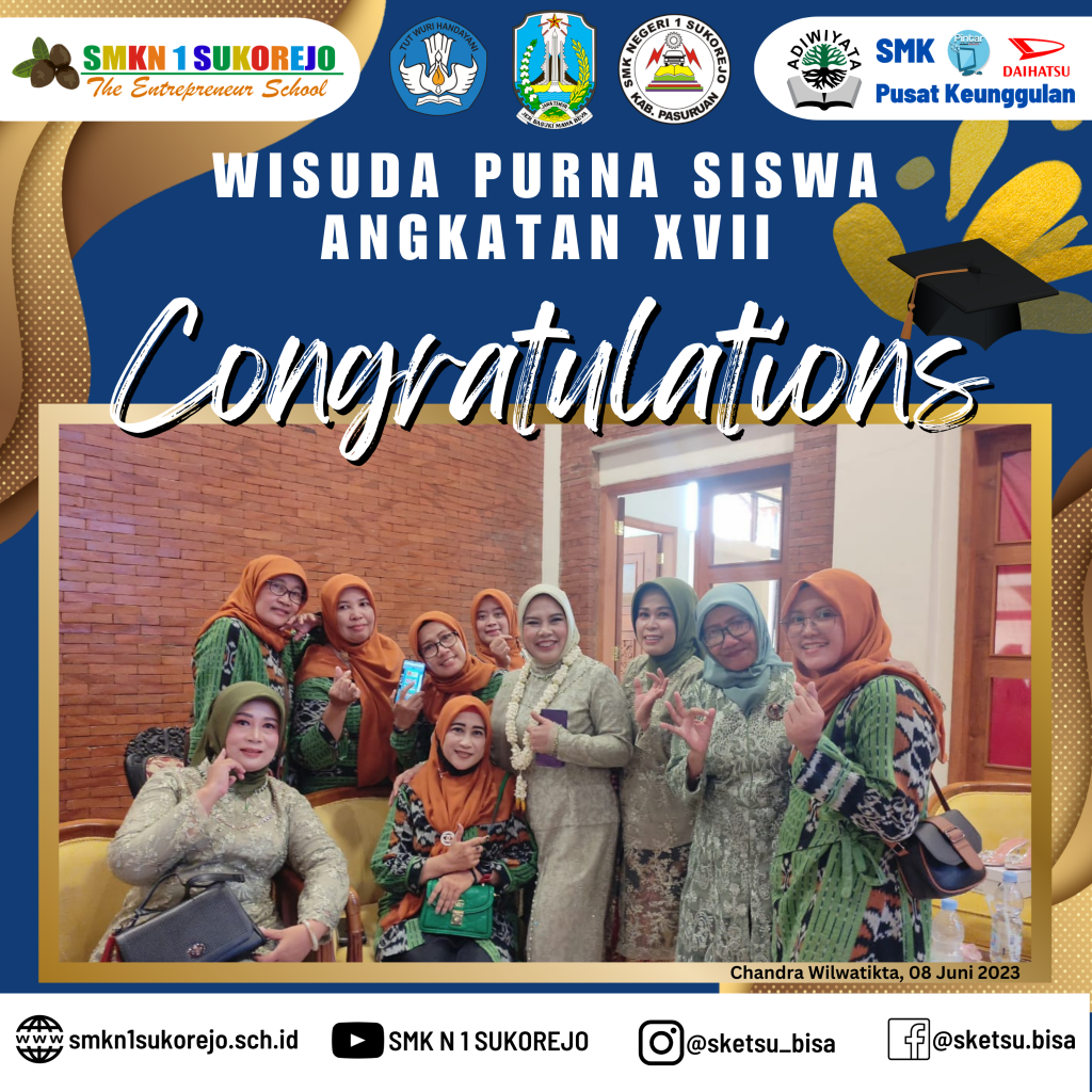 WISUDA PURNA SISWA ANGKATAN XVII SMK NEGERI 1 SUKOREJO Agenda Sekolah Informasi Sekolah Kegiatan Sekolah 9 Juni 20239 Juni 2023 adminLeave a Comment on WISUDA PURNA SISWA ANGKATAN XVII SMK NEGERI 1 SUKOREJO [SKETSU BERAKSI]Alhamdulillah serangkaian acara wisuda purna siswa SMK Negeri 1 Sukorejo telah sukses terselenggara di Taman Chandra Wilwatikta Pandaan.Selamat dan Sukses kepada 365 Wisudawan Tahun Pelajaran 2022/2023 SMK Negeri 1 Sukorejo yang telah menyelesaikan program belajar selama 3 Tahun.Awal yang baru telah dimulai, jangan berhenti belajar dan berpetualang, teruslah berusaha menjemput kesuksesan kalian.Buktikan bahwa Alumni SMK Negeri 1 Sukorejo bisa BMW (Bekerja, Melanjutkan dan Wirausaha)#smkn1sukorejo#sketsu#smkbisa#smkhebat#sketsubisahebat#sketsuberaksi#berakhlak#berkarya#berprestasi#wisuda#alumni2023#angkatan17 GALLERY
