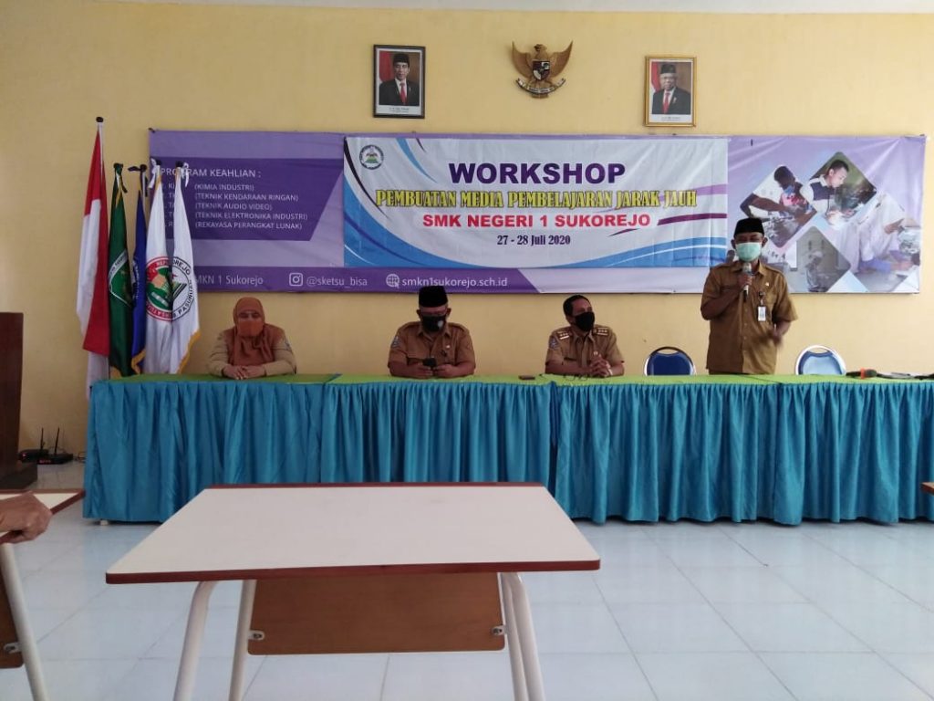 Dalam rangka peningkatan mutu dan kompetensi IT bagi guru, SMK Negeri 1 Sukorejo mengadakan Workshop Pembuatan Media Pembelajaran Jarak Jauh yang dilaksanakan pada hari Senin, 27 Juli 2020 sampai Selasa, 28 Juli 2020. Kegiatan Workshop diikuti oleh semua guru SMK Negeri 1 Sukorejo dari semua mata pelajaran baik normatif, adaptif maupun produktif. Pelaksanaan kegiatan dikelompokkan dalam 4 ruang sesuai mata pelajaran yang diampu. Diantaranya, ruang 1 kelompok MIPA, ruang 2 kelompok PAI dan Sosial, ruang 3 kelompok Produktif, dan ruang 4 kelompok Bahasa dan PJOK. Workshop Pembuatan Media Pembelajaran disampailan oleh pemateri yang profesional di bidang IT. Kegiatan ini diharapkan benar-benar menjadikan inovasi bagi para guru khususnya di SMK Negeri 1 Sukorejo. Adapun materi yang diberikan pada pelaksanaan workshop antara lain: Google Form, Google Drive, Google Meet, Google Classroom, Google Site dan Recording. Mengingat workshop ini berkaitan dengan peningkatan Sumber Daya Manusia (SDM) pada lingkup pendidik, maka Bapak Pengawas dari Dinas Pendidikan Provinsi pun dihadirkan sebagai upaya penyemangat dan sekaligus motivator bagi para guru terutama dalam persiapan mengajar bentuk daring maupun luring. Dengan kegiatan ini diharapkan para guru lebih mudah menyampaikan materi atau tugas kepada peserta didik begitu pula sebaliknya siswa-siswi mudah menyelesaikan tugas dari rumah. Pengawas yang hadir saat workshop adalah Bapak H. Masful, M.Pd dan Bapak H. Nuzulul. Beliau selalu memotivasi kegiatan workshop dengan penuh harap dan angkat topi karena SMK Negeri 1 Sukorejo berkeinginan untuk maju dalam peningkatan mutu pendidikan peserta didiknya.