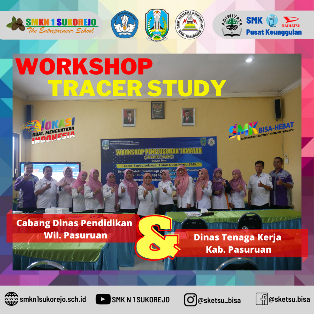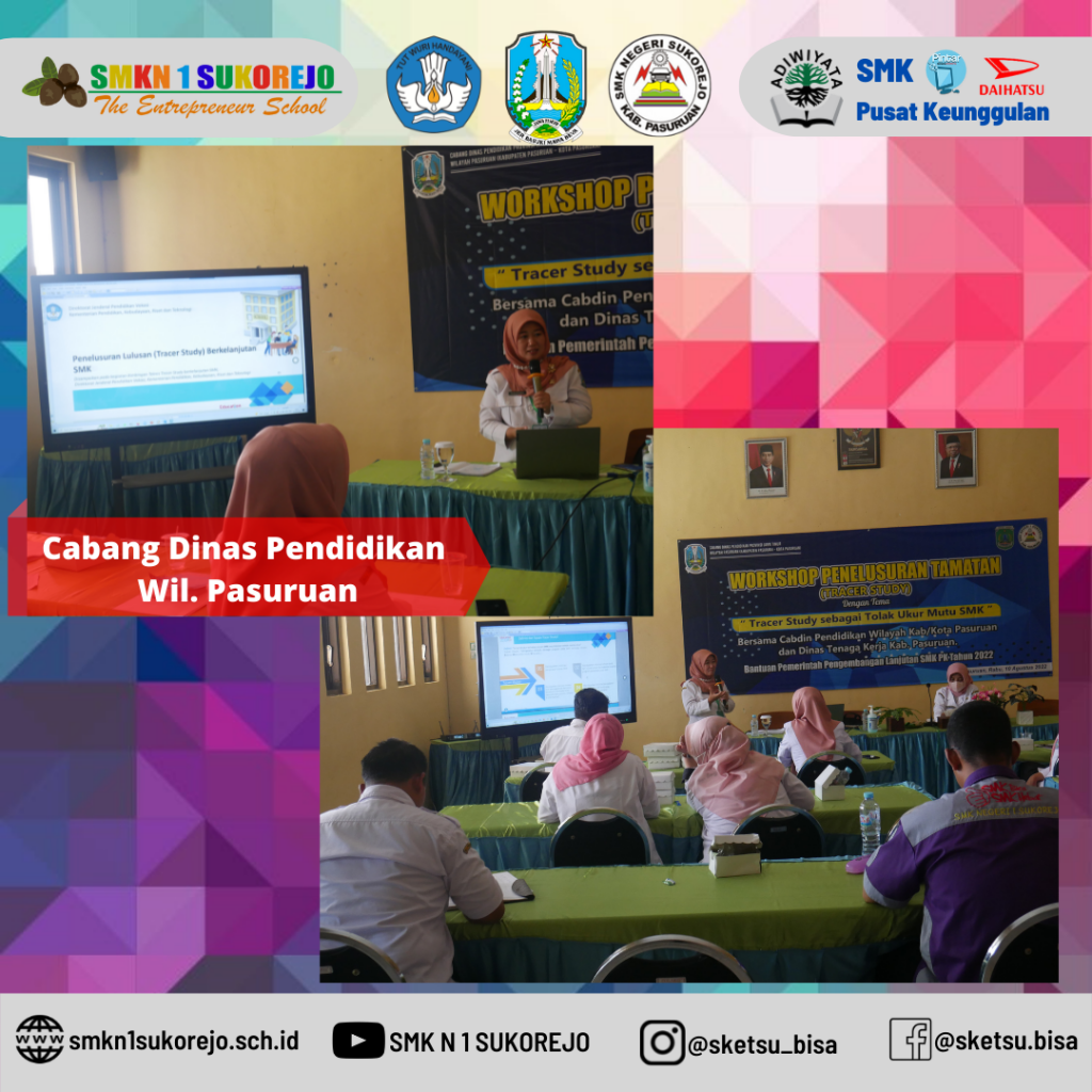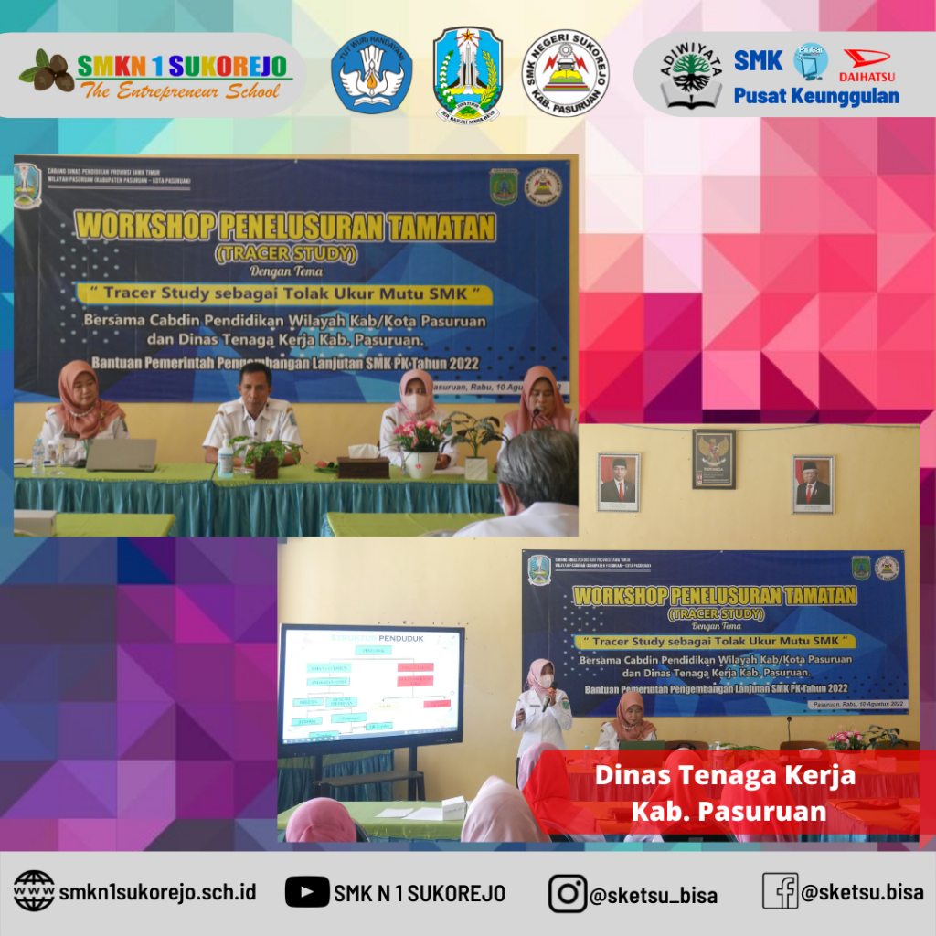 Pada hari ini , Rabu, 10 Agustus 2022 SMK Negeri 1 Sukorejo mengundang Ibuk Kasi SMK Kab./Kota Pasuruan (Ibu Mukarromah, S.ST.,MT) dan juga pihak Dinas Tenaga Kerja Kabupaten Pasuruan (Ibu Bachtiari Perihatin) untuk mensosialisasikan pentingnya Tracer Study bagi Sekolah Menengah Kejuruan. Kegiatan ini diikuti oleh 15 peserta yang terdiri dari Tim manajemen sekolah, Kakomli, Guru BK dan juga Team BKK.